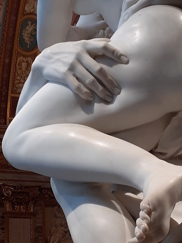 Caravaggio aside, highlights of the first floor include Bernini’s captivating sculpture of the Rape of Proserpine, (Ratto di Properpina), in which Pluto’s fingers sink into the flesh of Proserpine’s thighs (below left).